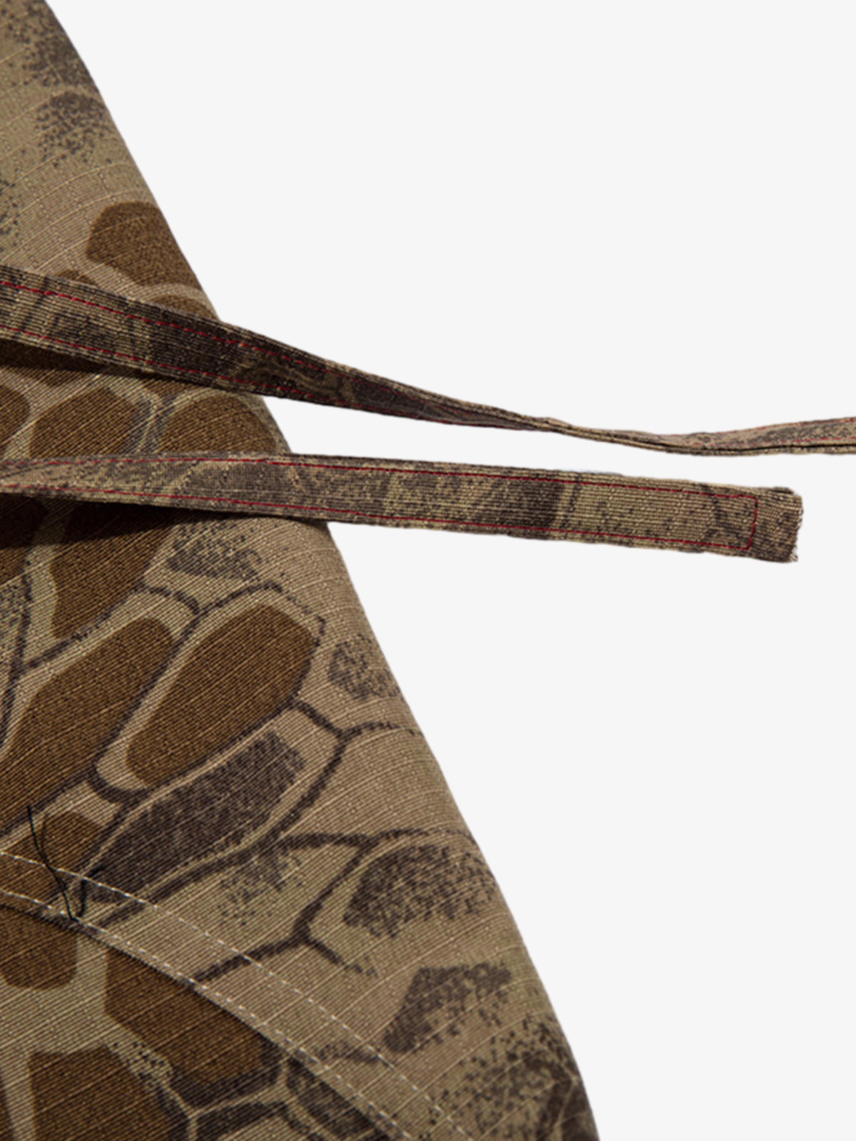 Özellikler: Kamuflaj desen, kapaklı yan cepler, ayarlanabilir bağcıklı bel, yan yırtmaçlı düğme detayları