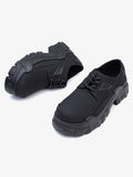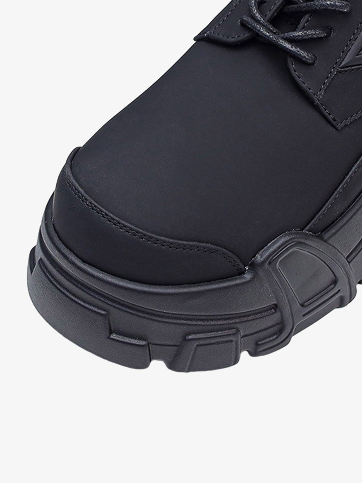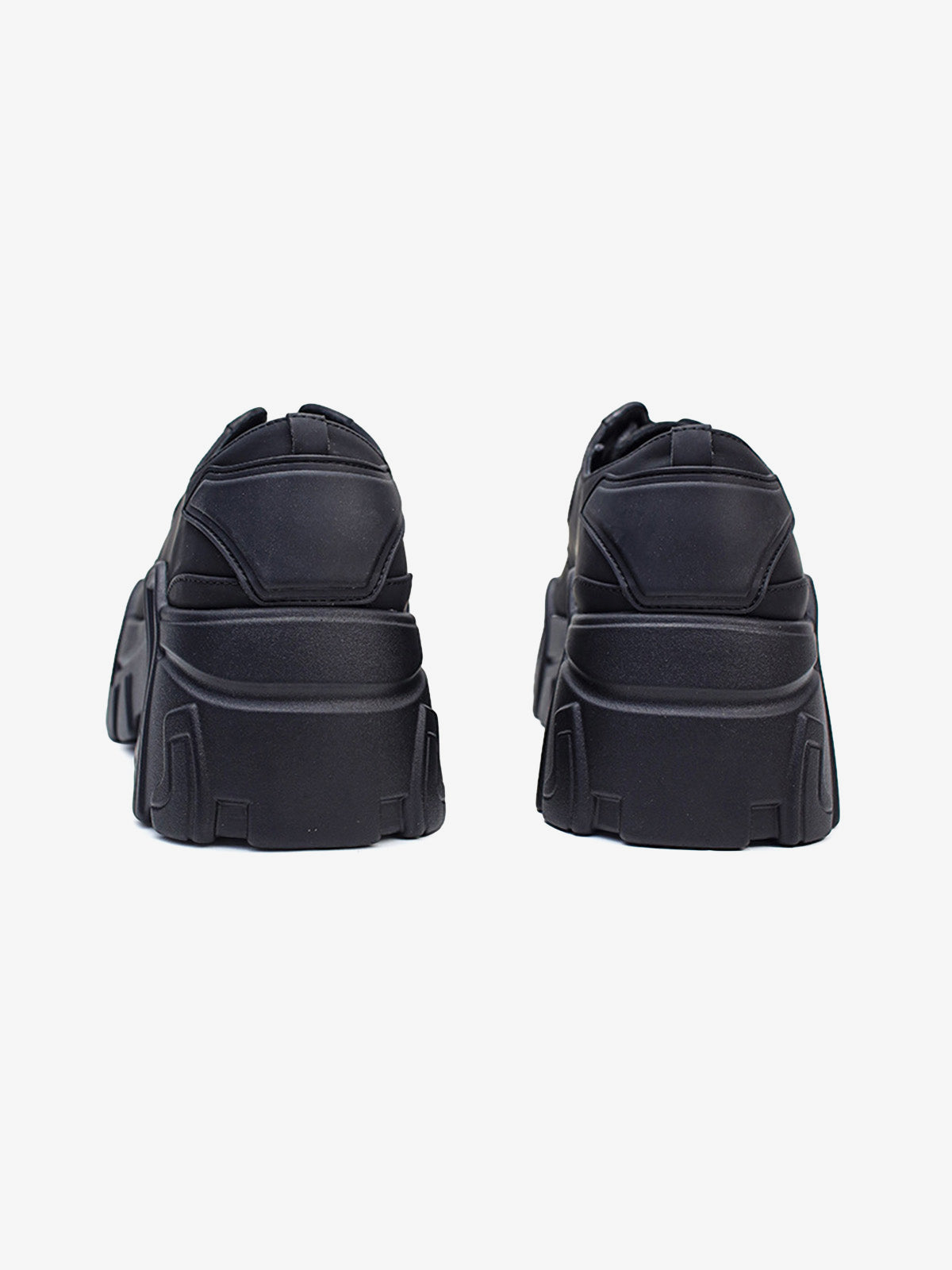 Özellikler: Minimalist siyah tasarım, bağcıklı kapama, geometrik desenli chunky taban
