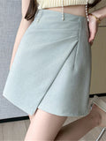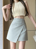 Özellikler: Asimetrik ön tasarım, overlap katman detayı, zarif pile dokunuşu, yüksek bel kesim, mini boy uzunluk