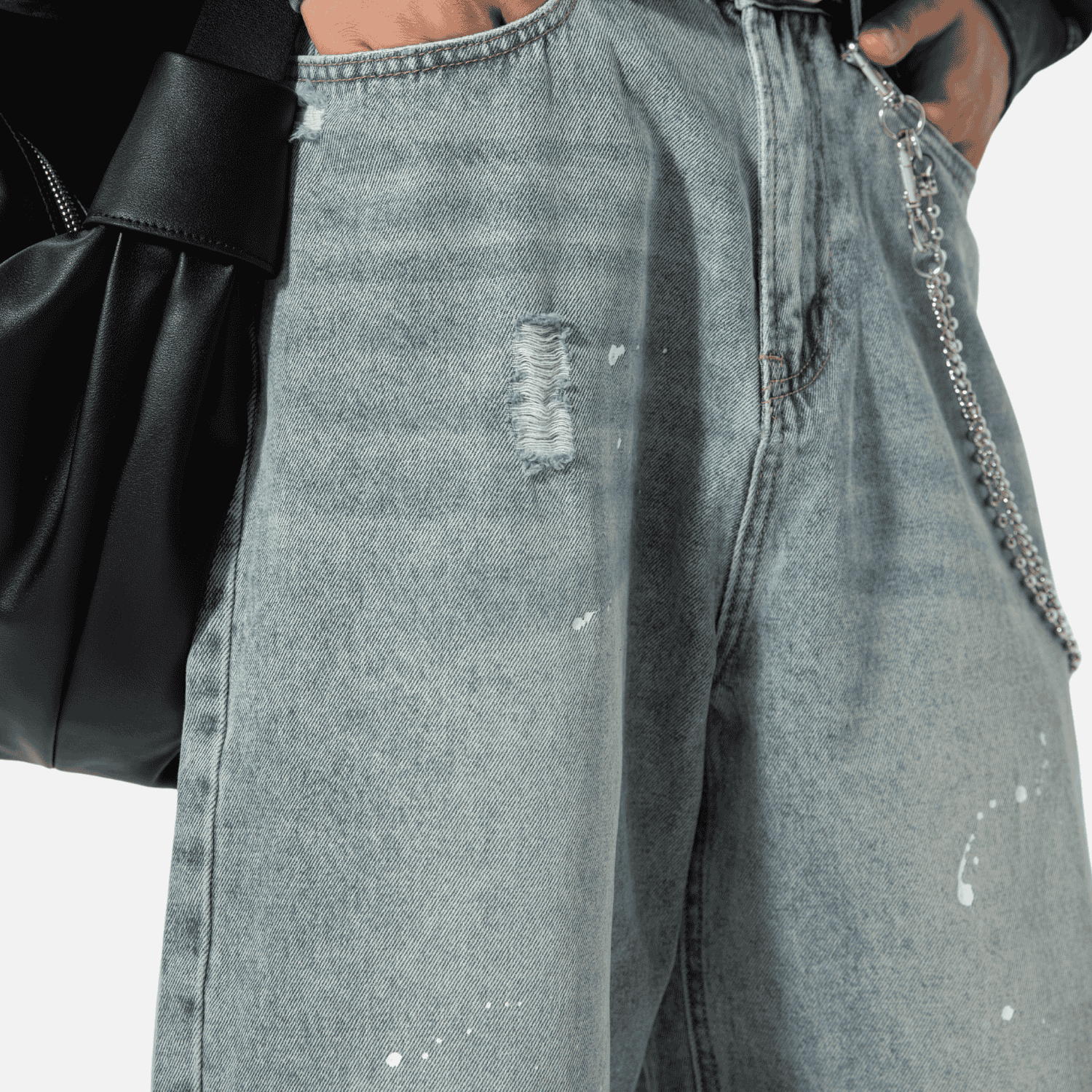 Özellikler: Loose retro fit kesim, straight leg paça, yıpratma detayları, özgün paint-splatter yıkama efekti, düğmeli kapama, %60.1 pamuk karışımlı kumaş