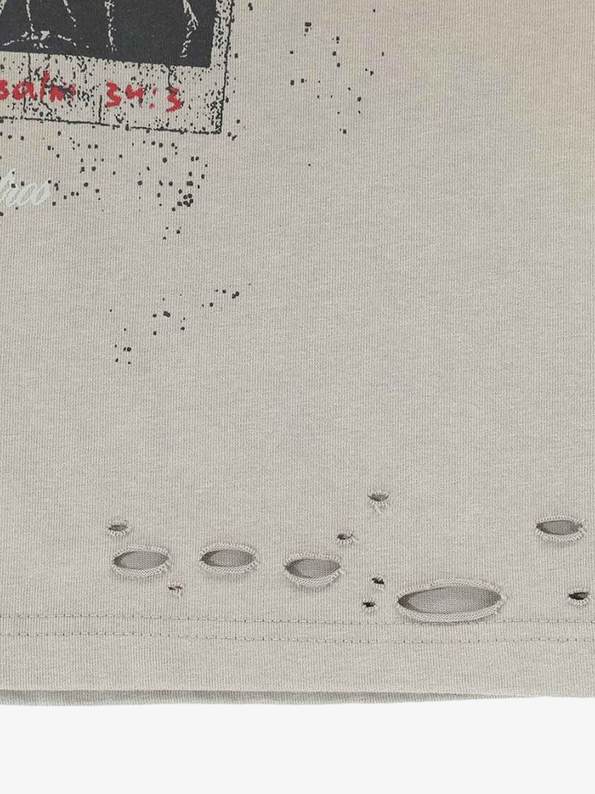 Eskitme detayları, göğüs kısmındaki grafik baskı ve boya sıçrama efektiyle bu tişört, sokak modasında iddialı bir görünüm sunuyor. Günlük kombinlerde jean ya da şortlarla kolayca eşleşerek tarzına özgün bir enerji katıyor.