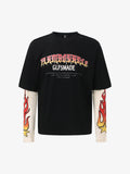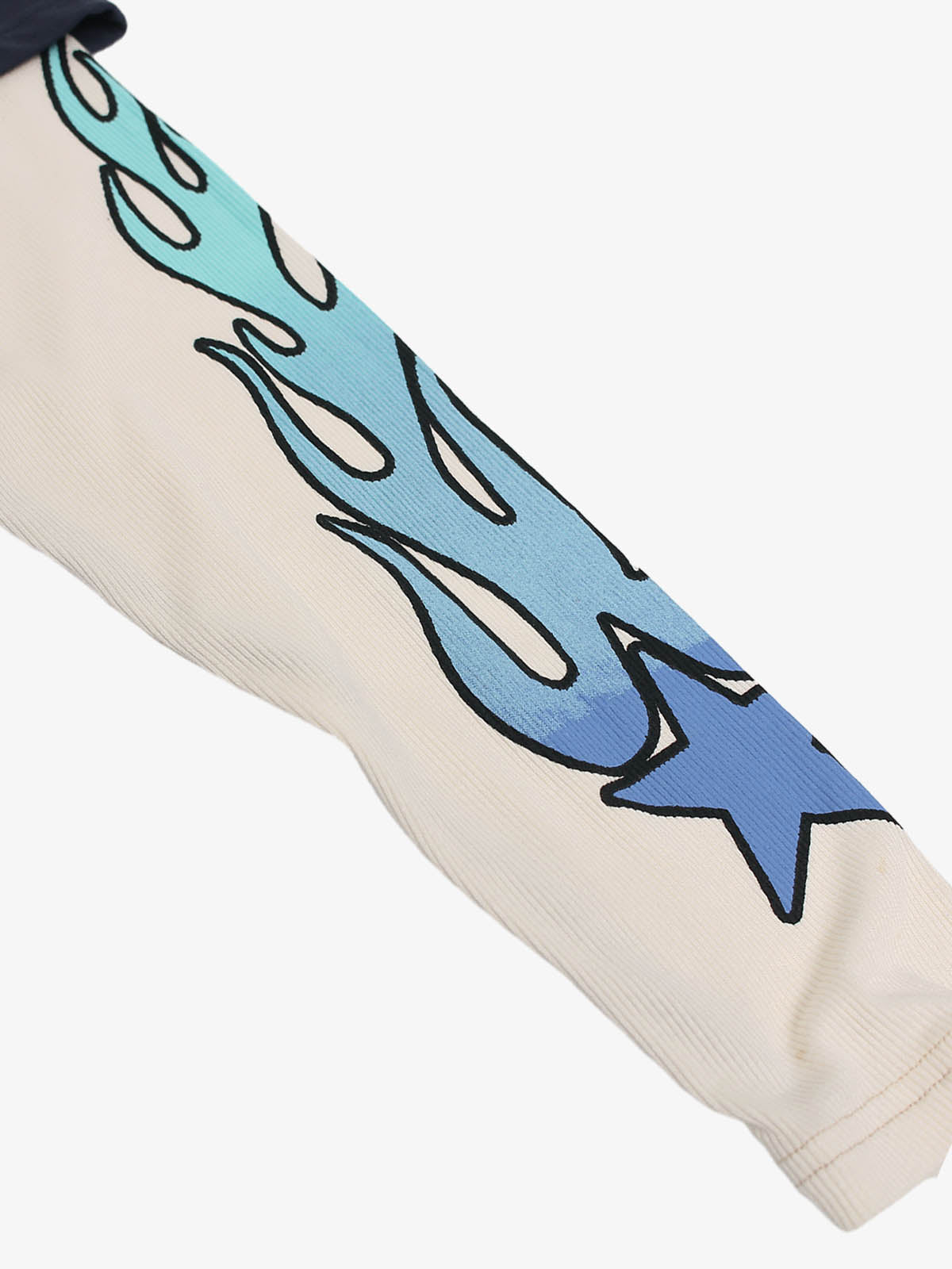 Kollarındaki alev grafikleri ve ön kısmındaki cesur yazı tasarımıyla bu uzun kollu tişört, sokak stiline dinamik bir enerji katıyor. Yıldız detaylarıyla desteklenen görünümü, festivallerden günlük şehirlere kadar her yerde dikkat çekici bir tarz sunar.