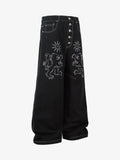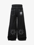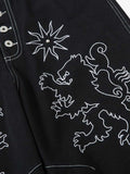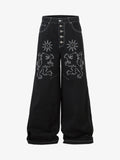 Ejderha ve yıldız nakış detaylarıyla öne çıkan bu jean, yüksek kalitede işçiliğiyle sokak stiline güçlü bir imza atıyor. Geniş paça formu rahatlığı modern bir şıklıkla buluştururken, çok düğmeli kapama klasik ve sofistike bir bitiş sağlar.