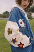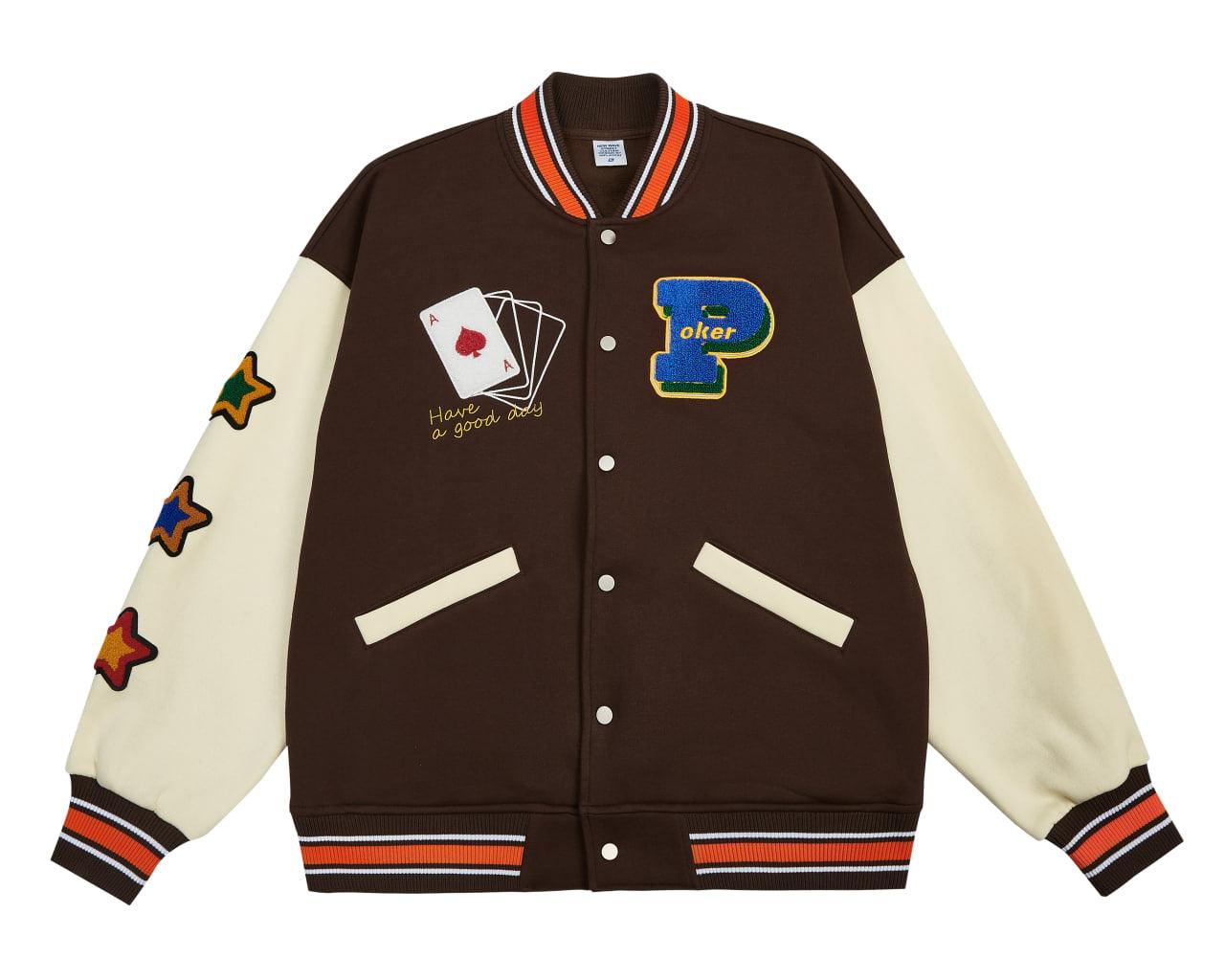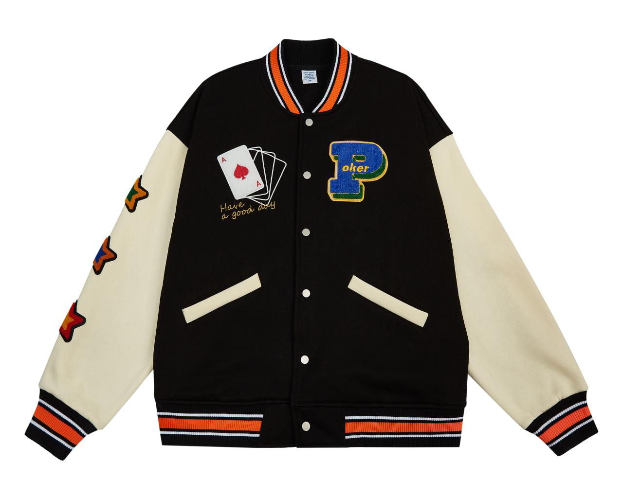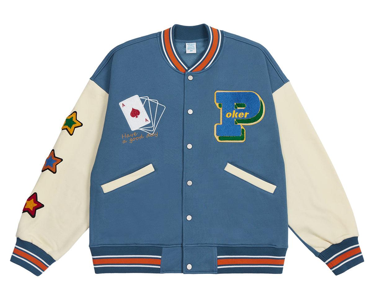 Poker Beyzbol Ceketimizle moda ikramiyesini yakalayın. Üniseks ve şık bu ceket, eğlenceli bir poker dokunuşuyla klasik beyzbol ceketi tasarım öğelerine sahiptir. Grubunuza eğlenceli bir dokunuş katmak için mükemmel olan bu modaya uygun ve çok yönlü parçayla sokak giyimi oyununuzu yükseltin.