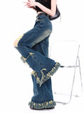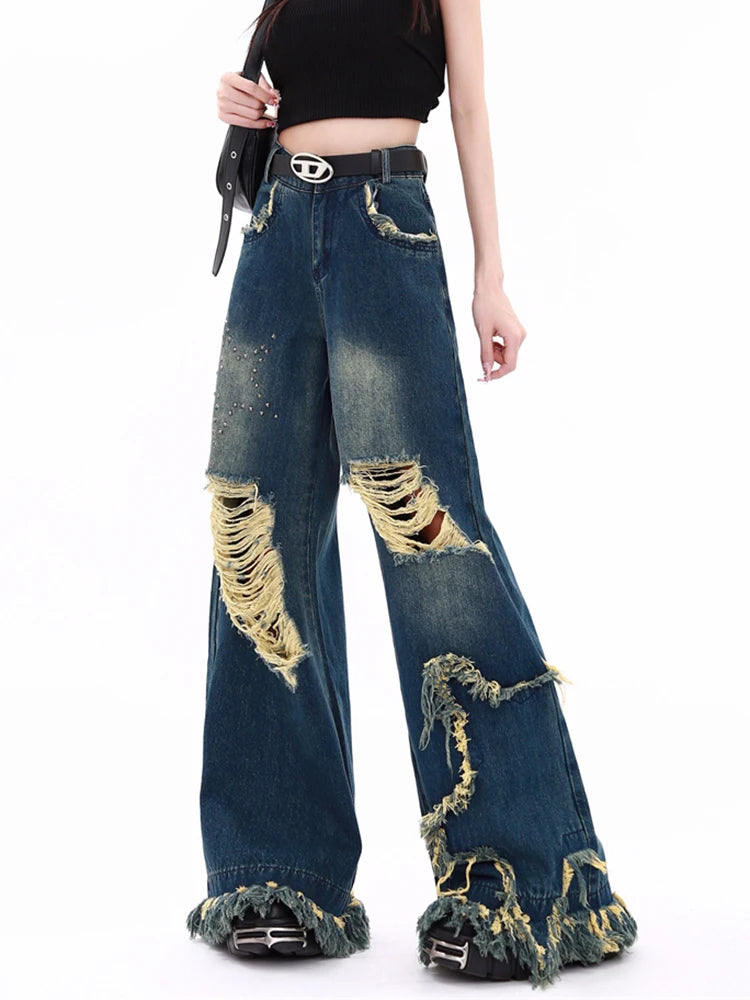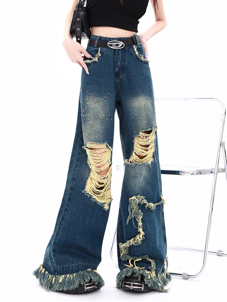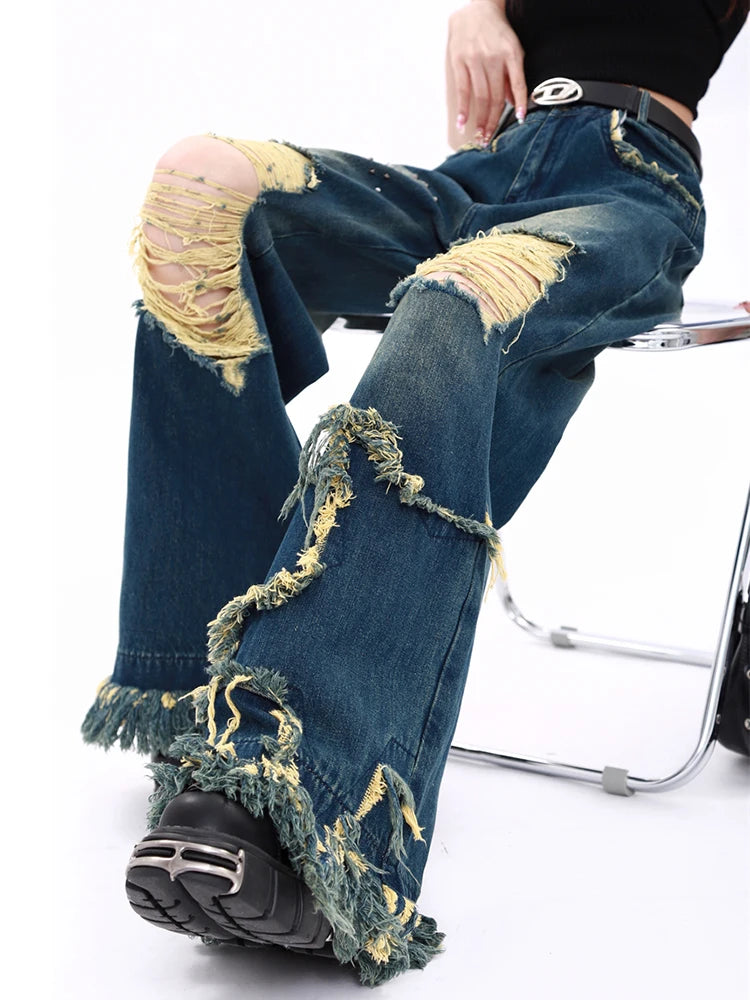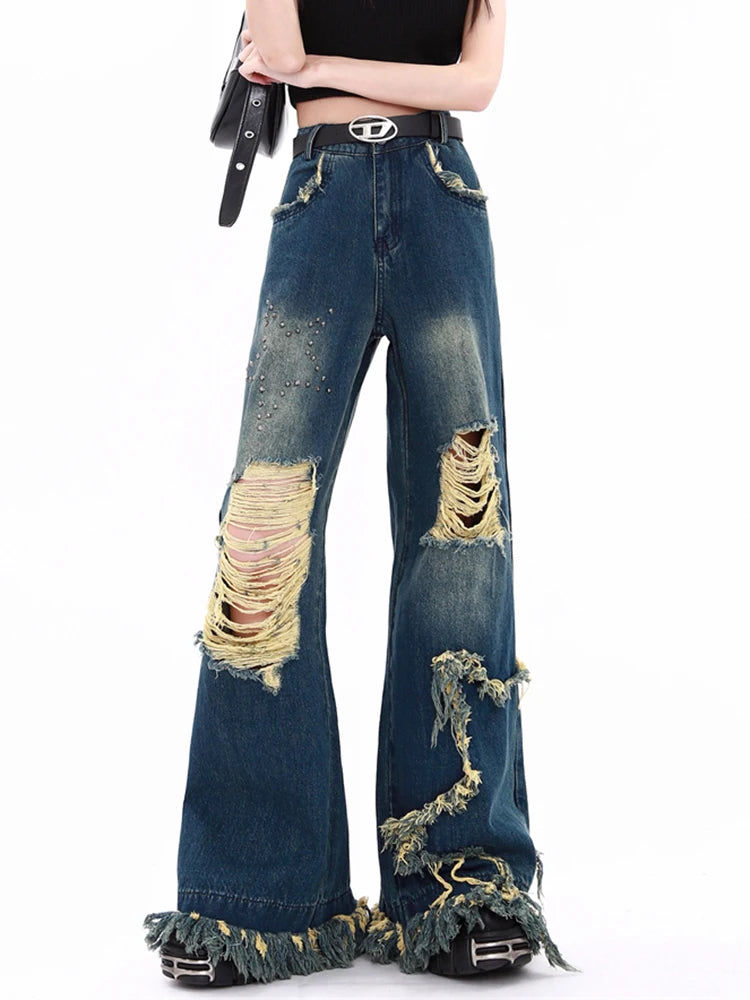 Amerikan retro tarzının en çarpıcı örneği olan bu yırtık kot pantolon ile kendinizi ifade edin! Hem rahat hem de cesur bir görünümle sokak modasında fark yaratın.