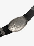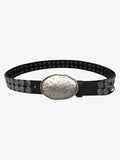 Hakiki deri yapısı ve zımba detaylarıyla bu retro kemer, hem dayanıklılığı hem de stil gücünü bir araya getiriyor. Oymalı tokası, cesur punk havasını sofistike bir dokunuşla tamamlıyor.