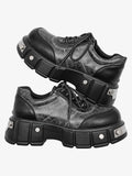Deri yapısı, zincir aksesuarı ve kalın taban tasarımıyla bu ayakkabı, sokak stiline cesur ve iddialı bir ifade katıyor. Bağcıklı formu ve metal stud detaylarıyla punk ruhunu modern şehir şıklığına taşıyor.