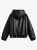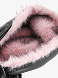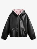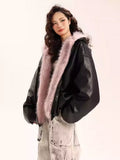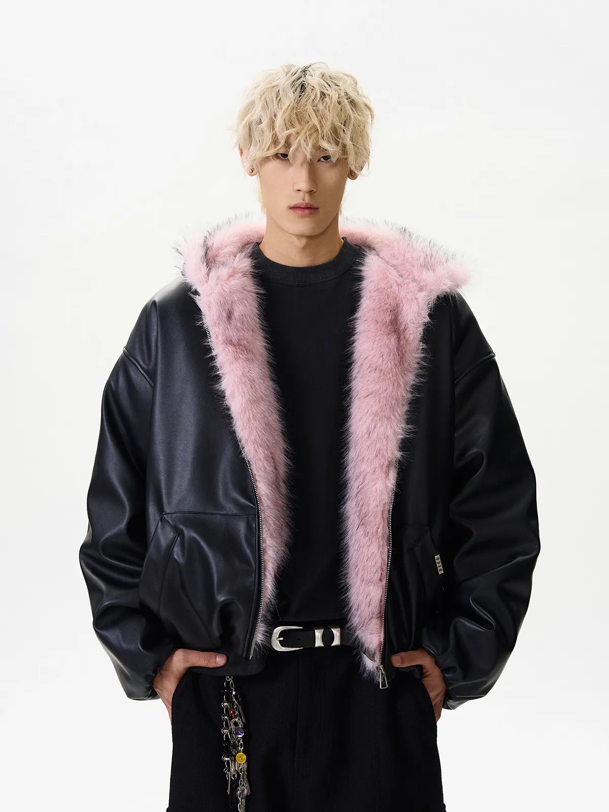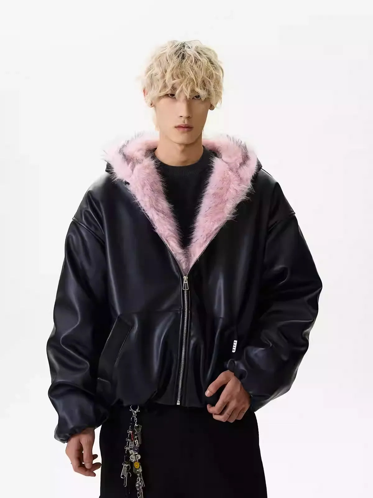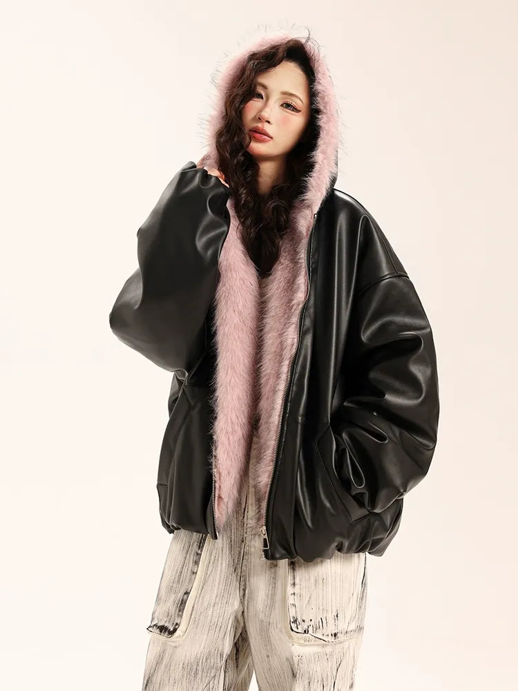 Deri Pembe Kürklü Kapüşonlu Kapitone Ceket