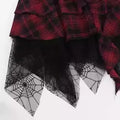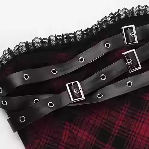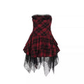Bu straplez elbise; korse formu, katmanlı ekose kumaşı ve tül dantel alt detaylarıyla punk ruhunu karanlık bir zarafetle birleştirir. Göğüs kısmındaki kemer ve metal toka detayları, tasarıma sert bir karakter kazandırırken, etek ucundaki asimetrik tül katmanlar silüete dramatik bir akış sağlar.
