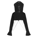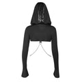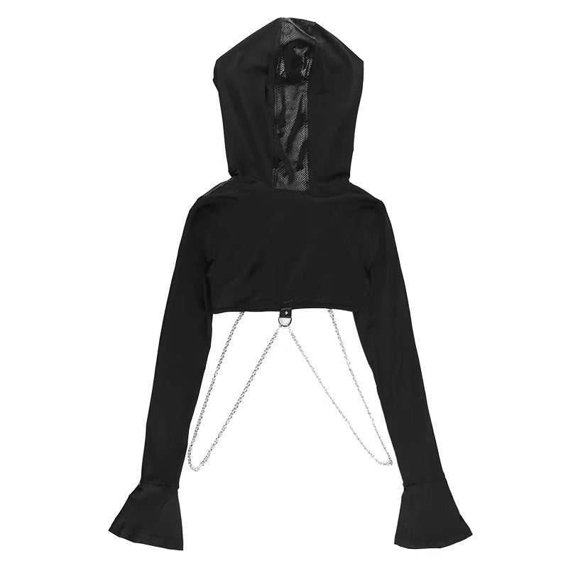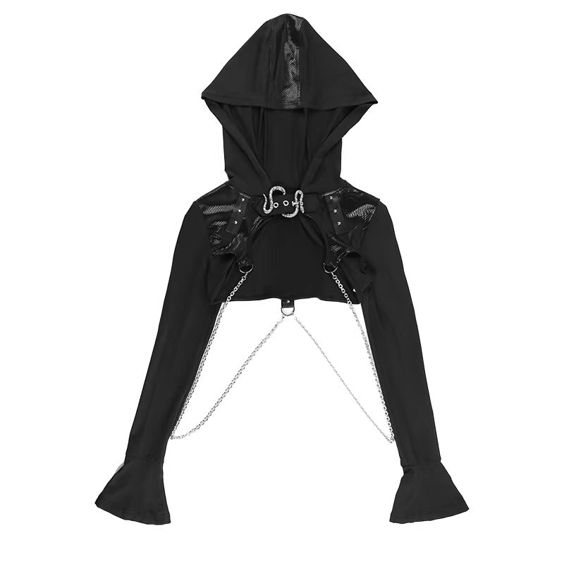 Kapüşonlu yapısı, vücudu saran crop formu ve metal zincir detaylarıyla bu tasarım; goth, techwear ve dark streetwear estetiğini tek bir silüette buluşturur. Göğüs üzerindeki metal tokalar ve alt bölümdeki zincir bağlantılar, ürünü sıradan bir üstten çıkarıp statement parça haline getirir.