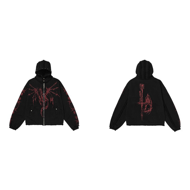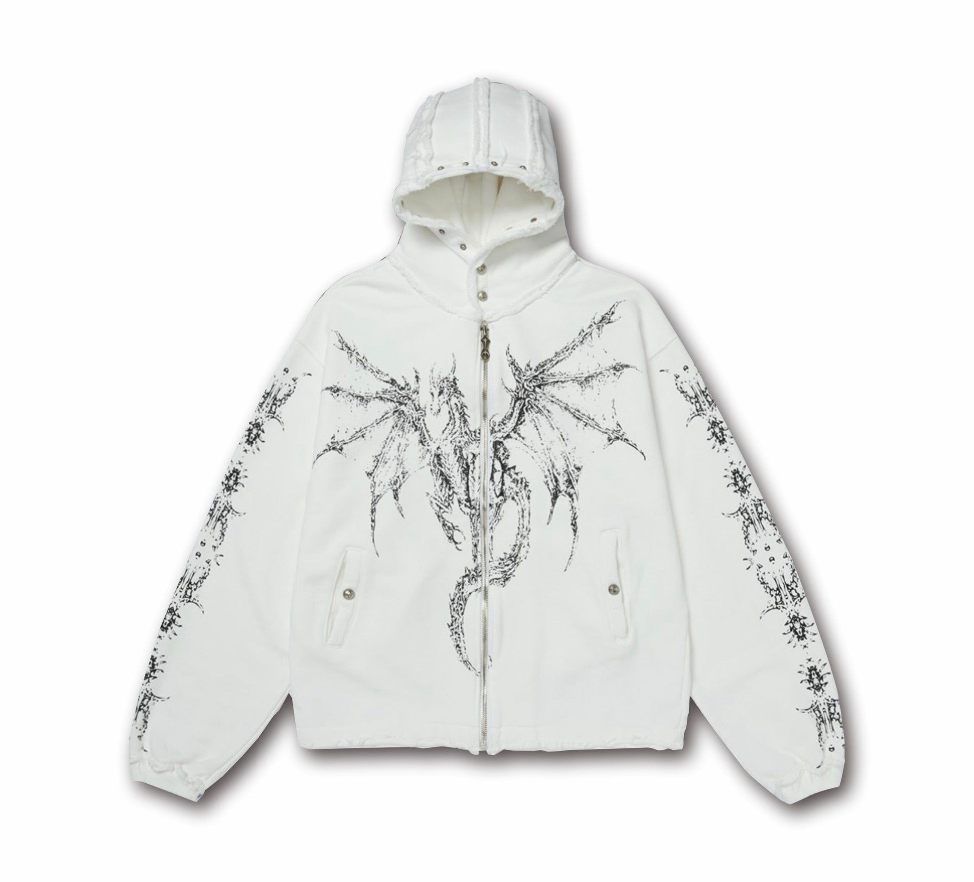 Özellikler: Fermuarlı tasarım, kapüşonlu, dikkat çekici ejderha grafiği, metal zımba (stud) detayları.